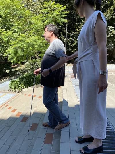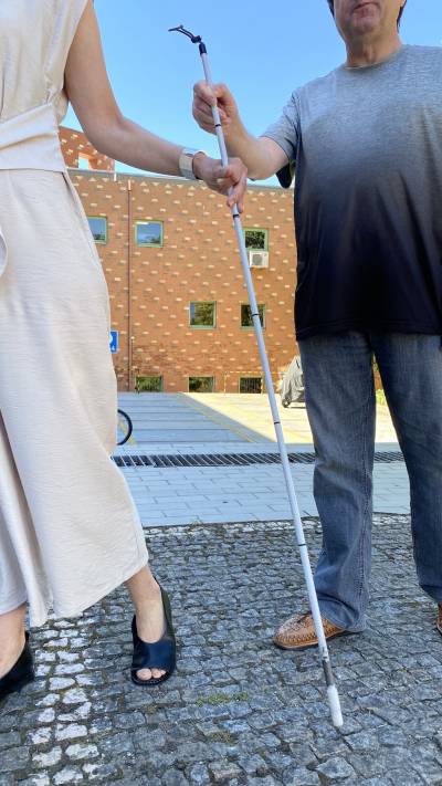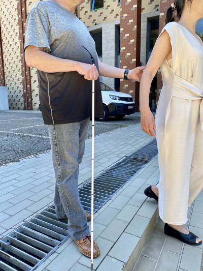 Caso se trate de uma pessoa cega e ela precisar de ajuda para atravessar, por exemplo, deve oferecer o braço e deixar que a pessoa caminhe ao seu lado ligeiramente atrás de si, desta forma a pessoa cega poderá aperceber-se com mais facilidade dos obstáculos.