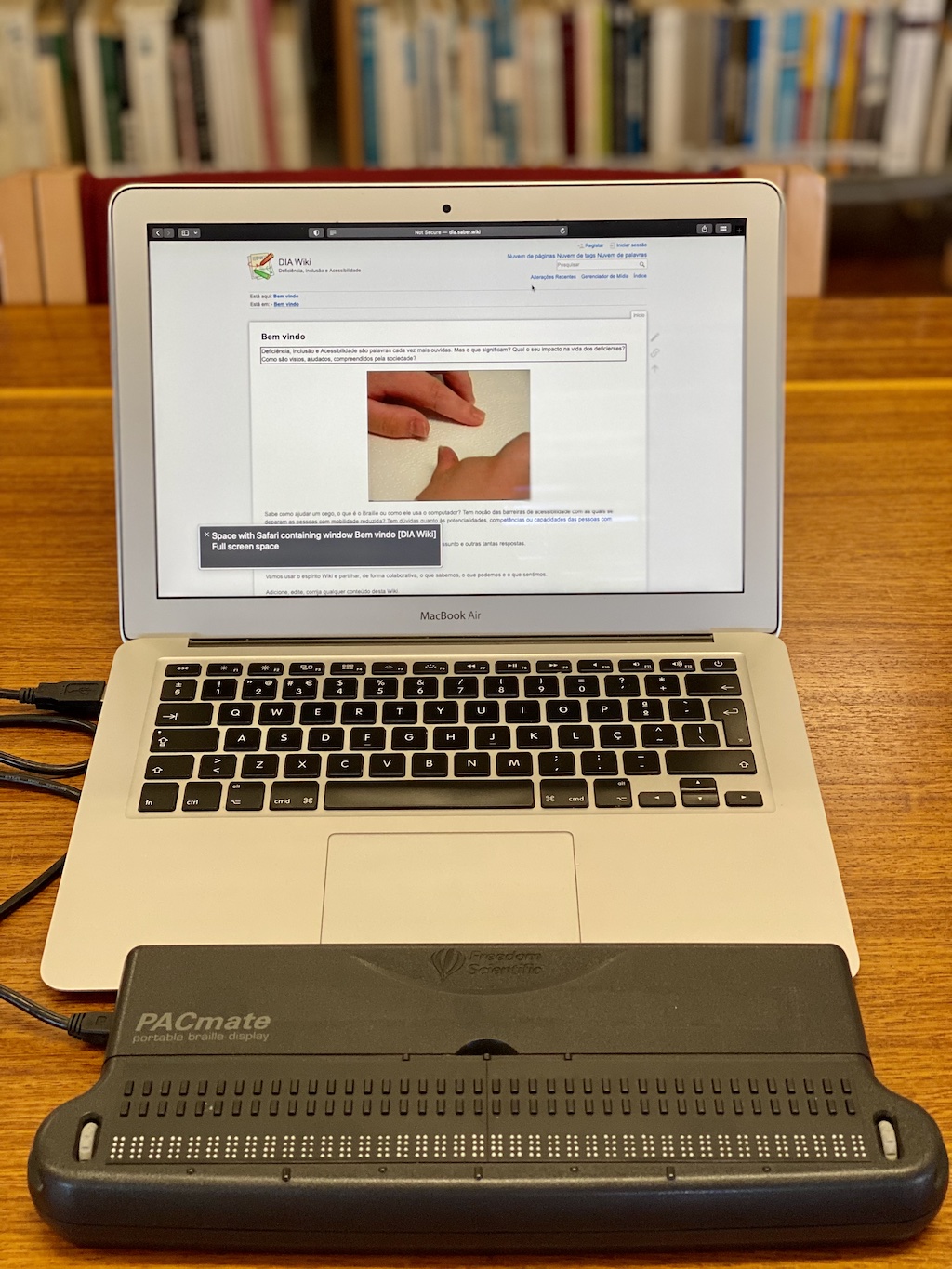 - Terminal braille com 40 células. Está ligado a um Mac. No terminal é possível ler em braille parte do texto mostrado no ecrã. O conteúdo visualizado é uma parte da página de entrada desta wiki.